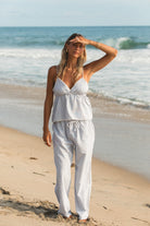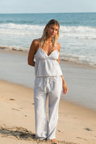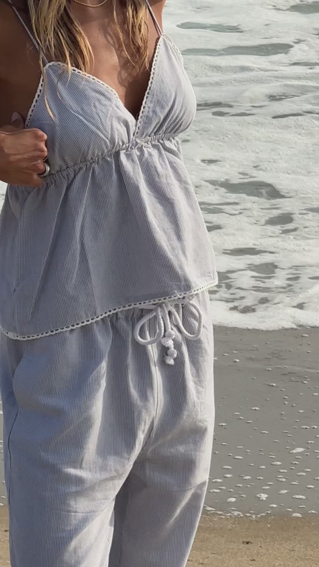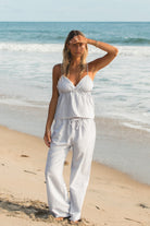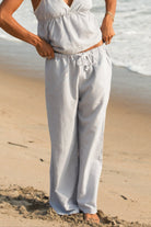Have a casual cool moment in these comfy drawstring pants, featured in the softest cotton linen blend with a micro-stripe pattern, perfect for lounging at home or stepping out in casual style.