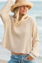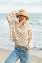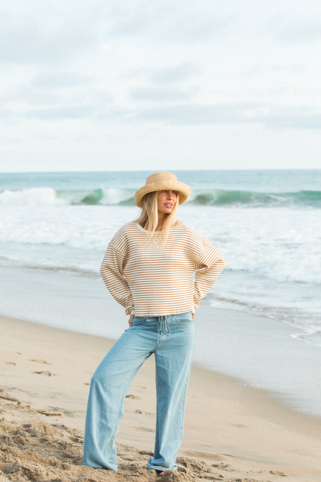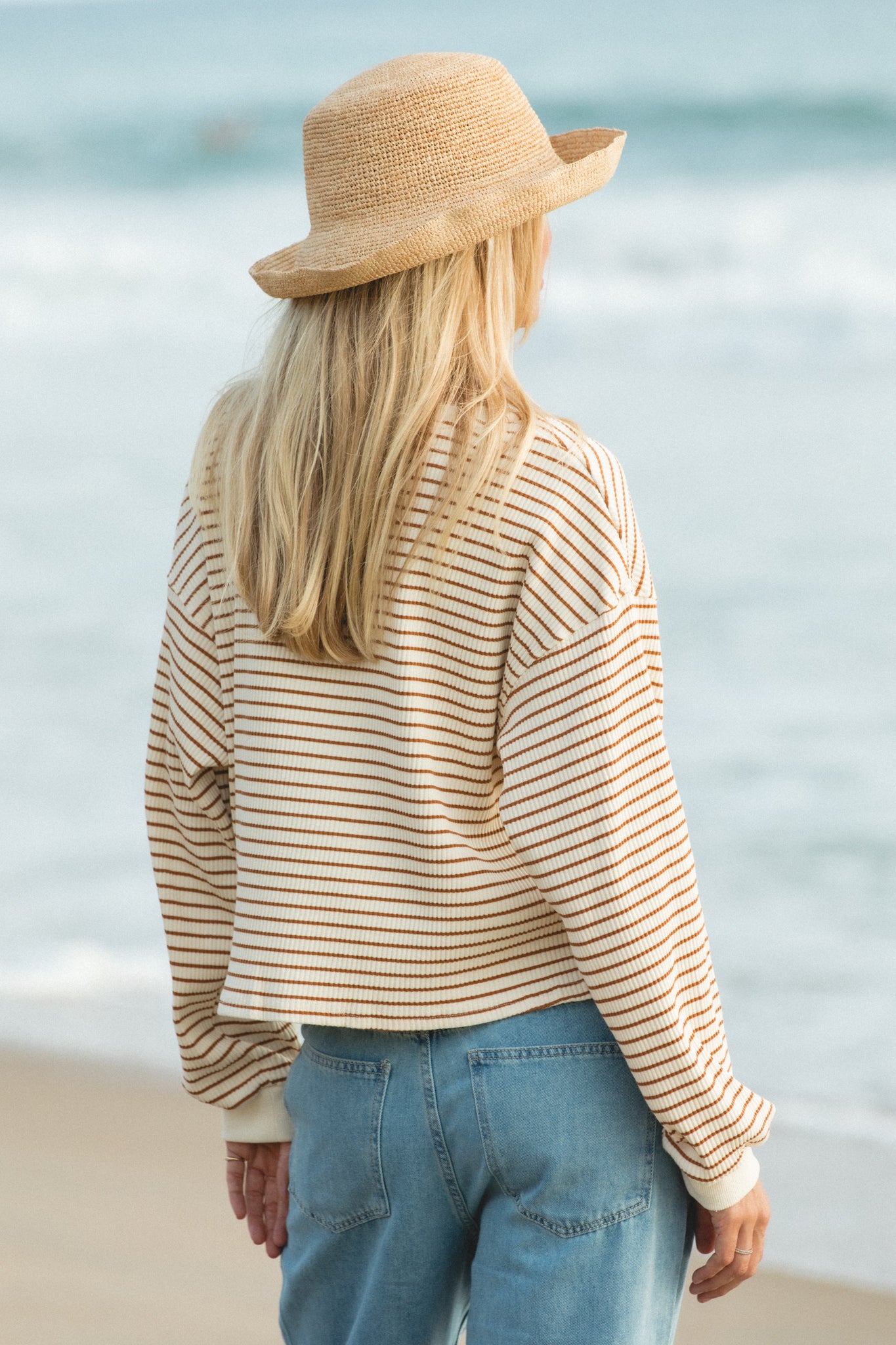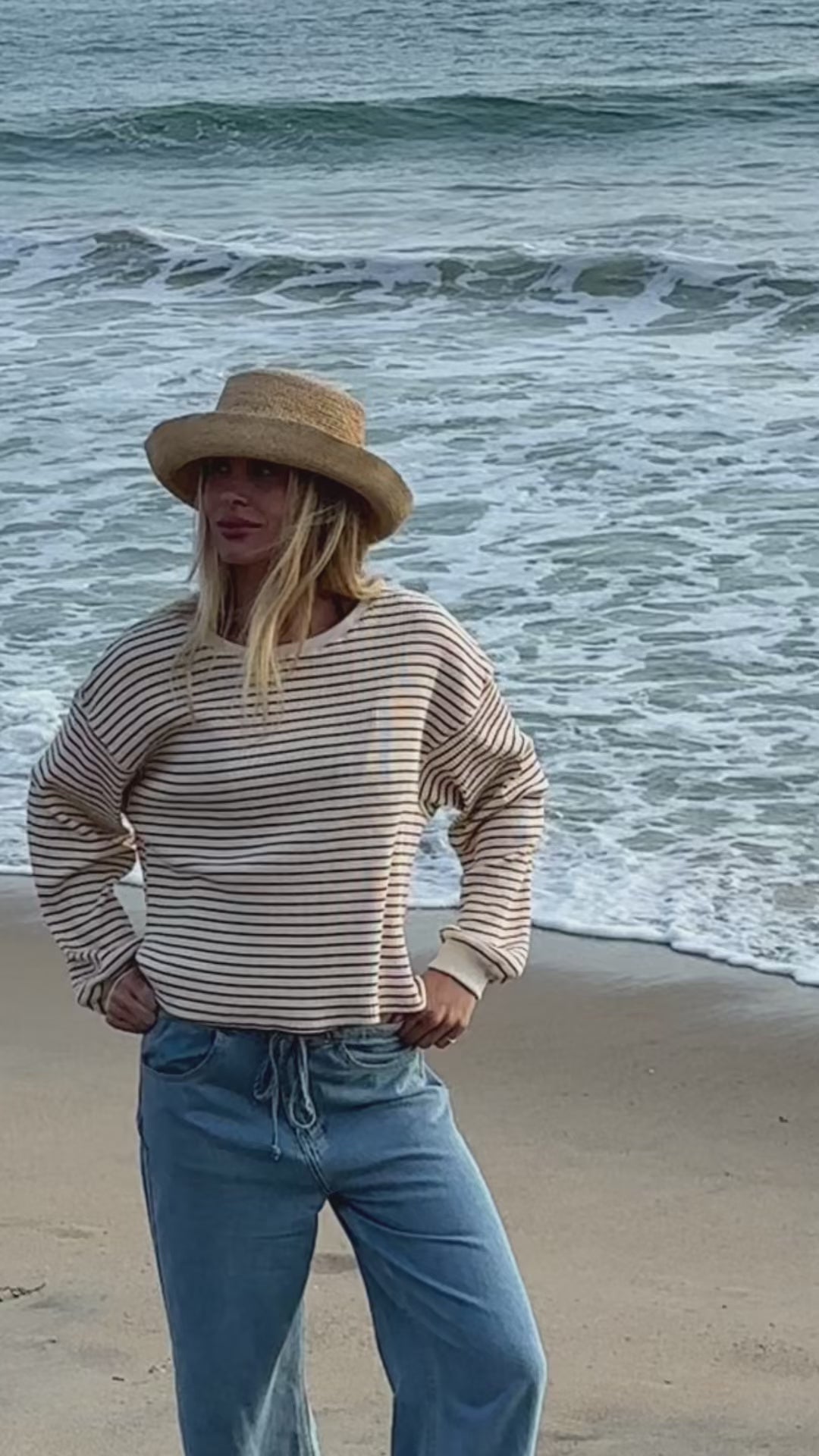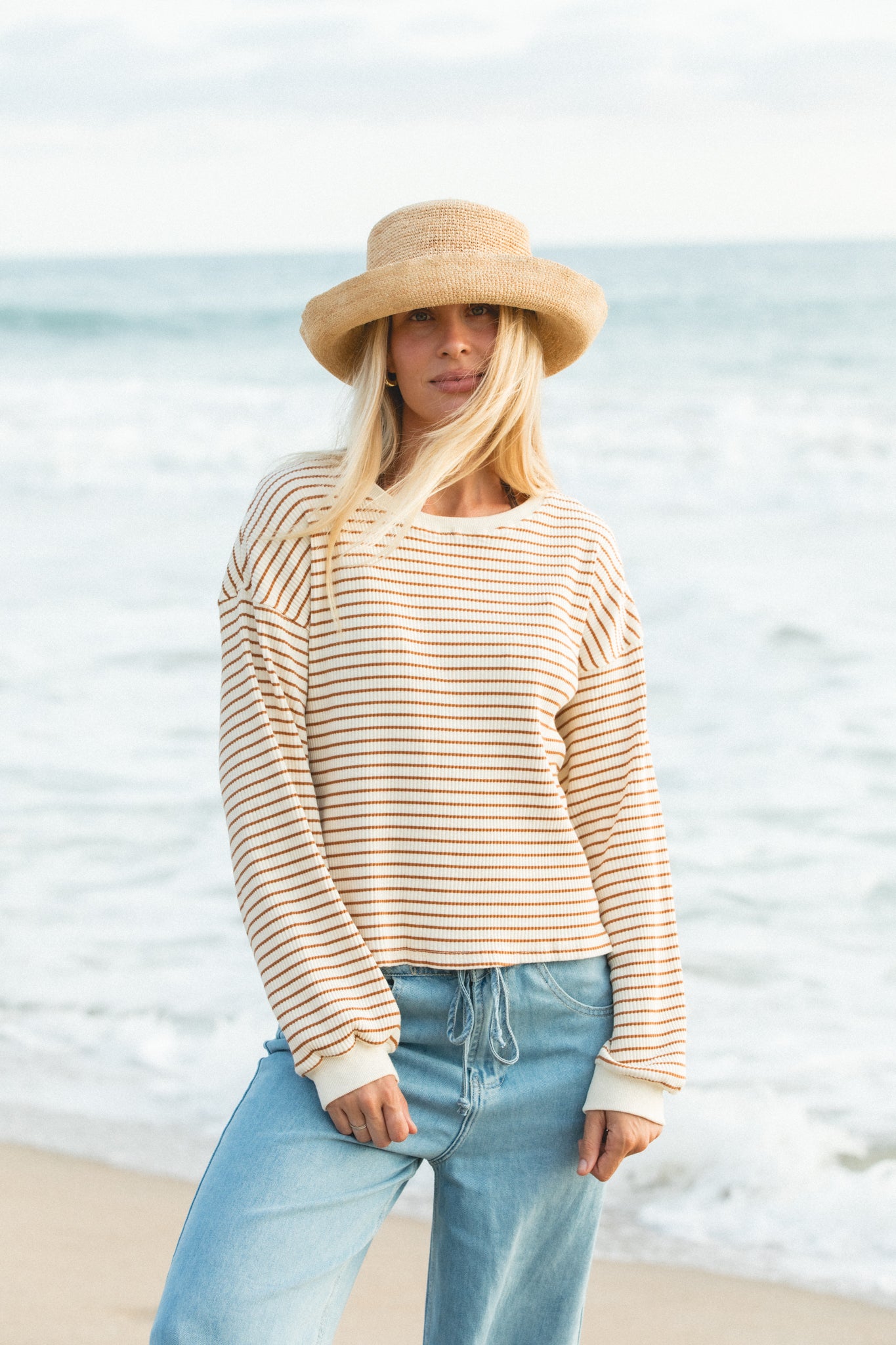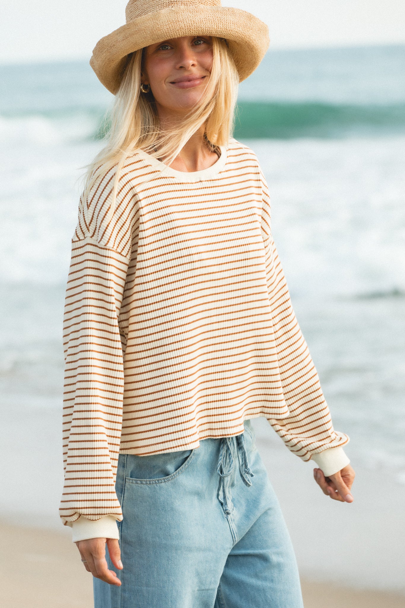 This ribbed crewneck long sleeve top features a relaxed, slouchy silhouette and staple striped print, finished with a thick cuffing and collar for elevated detail and structure.