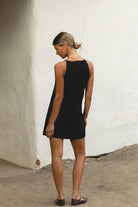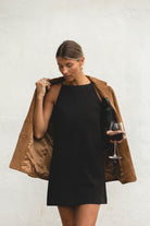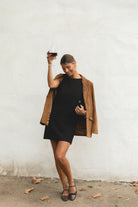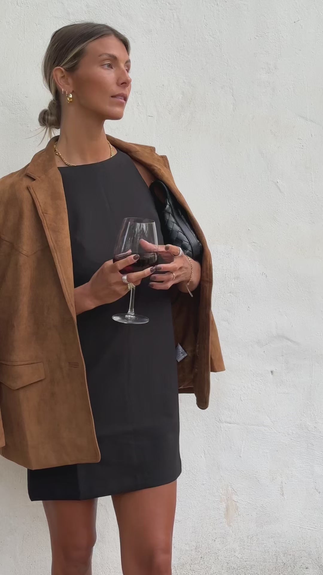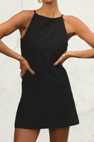 A timeless black mini made for fall occasions. Featuring a sleek halter neckline and flattering fit, it’s your go-to for dinner parties, holiday gatherings, and nights out. Effortless, elevated, and ready for the season.