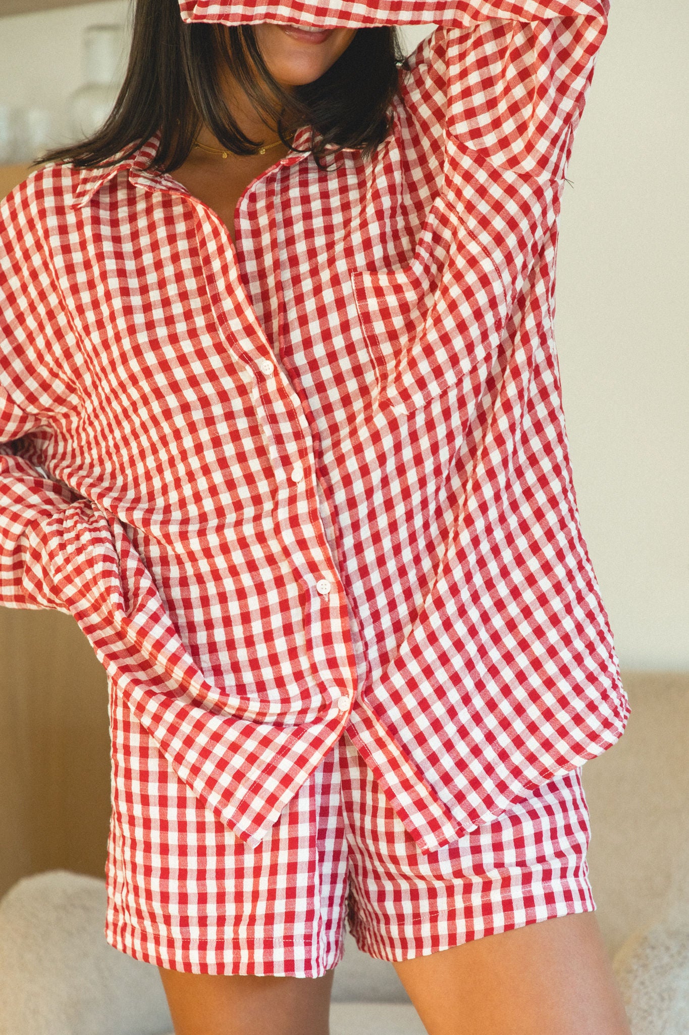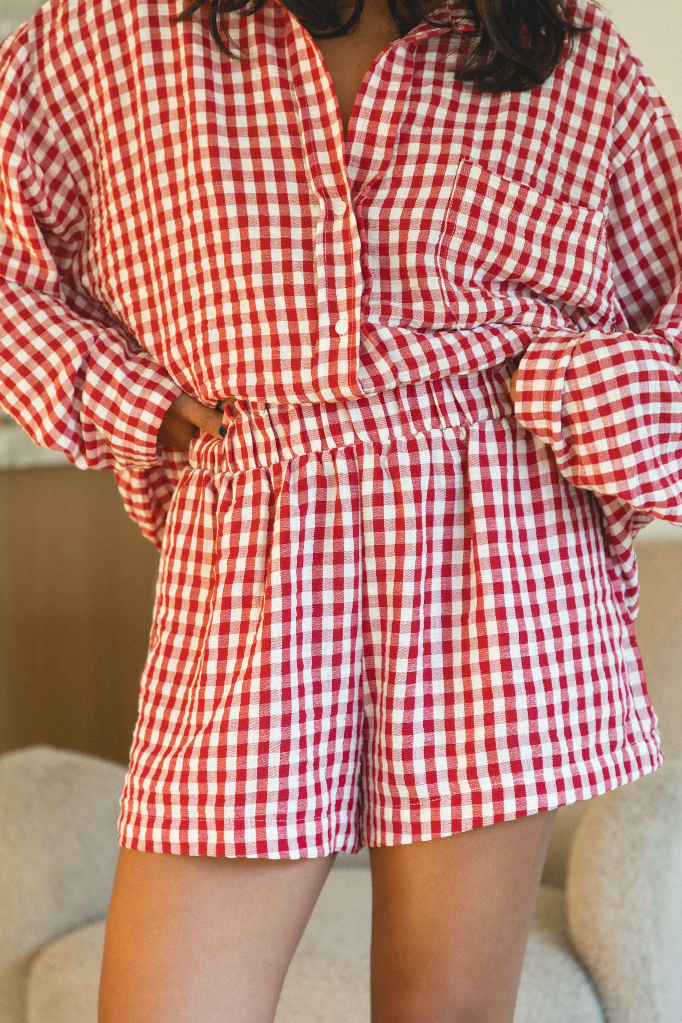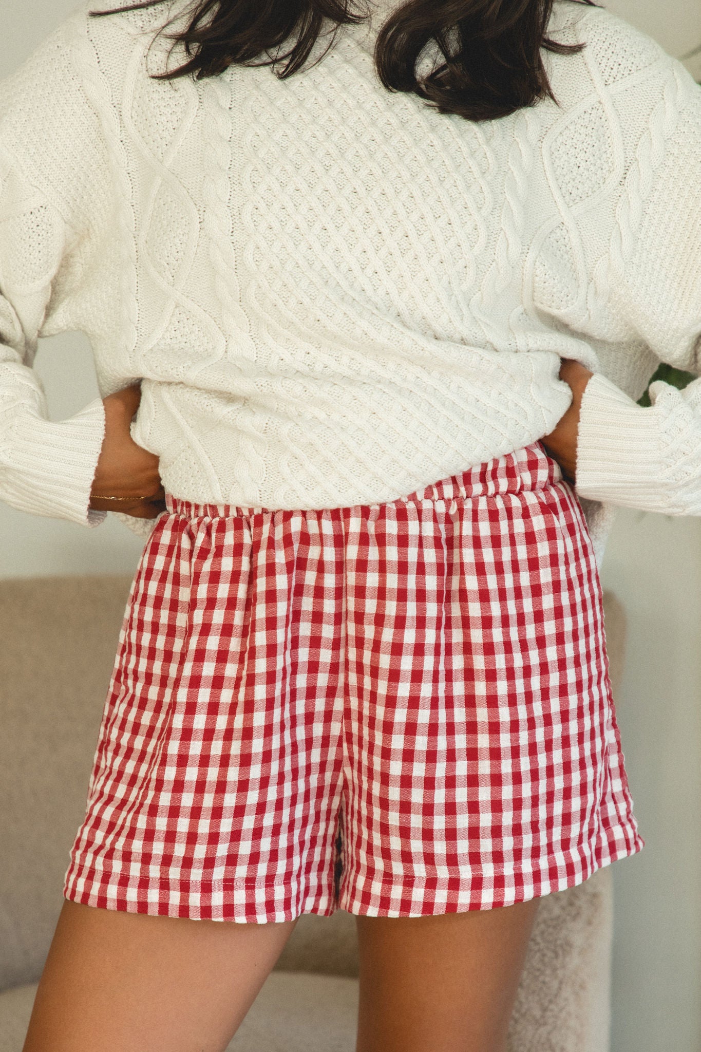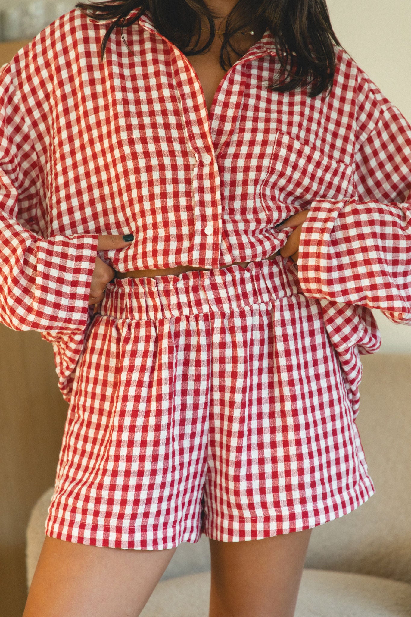 Stay festive and cozy all season long with our Christmas Morning Gingham Pajama Shorts. Made of soft, breathable fabric, these red and white gingham shorts have a stretchy elastic waist for the perfect fit. Get ready to relax and enjoy the holiday season!