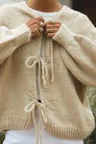 The Goldie Knit Cardigan, crafted from a soft wool blend, features front tie details and a relaxed oversized fit. Designed for cozy layering on crisp fall days, it blends effortless style with everyday comfort.