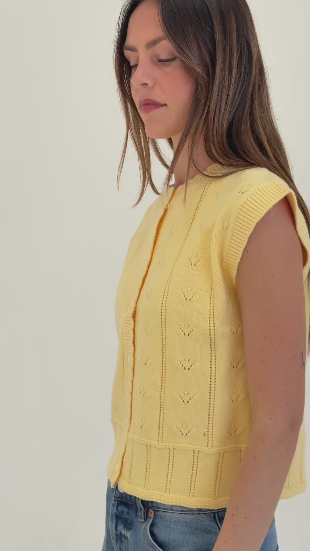 Sweet and soft in butter yellow, the Bloom Pointelle Button Top brings a delicate touch to your spring lineup. Designed in a lightweight knit with subtle pointelle detailing, it features cap sleeves and a classic button-front silhouette. Easy to style with denim or shorts.