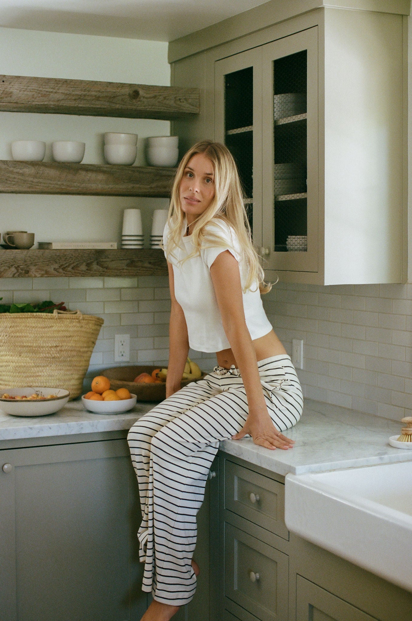The Alder Pants feature a flattering high-rise fit with a wide leg that elongates the silhouette. Crafted in lightweight cotton with bold black stripes, they bring a modern edge to classic loungewear. The elastic waistband ensures comfort, while the structured drape makes them polished enough for day-to-night wear.