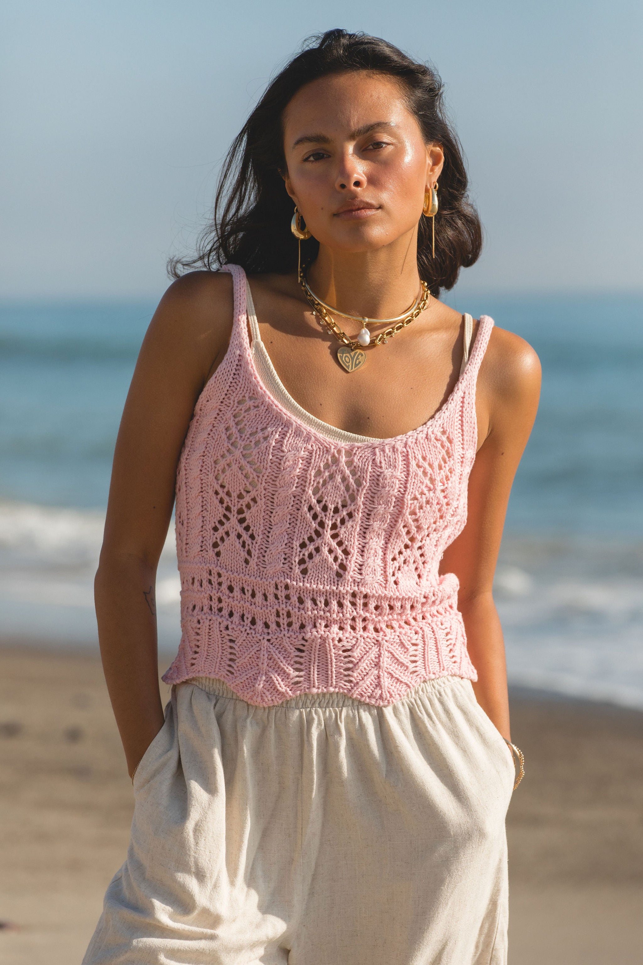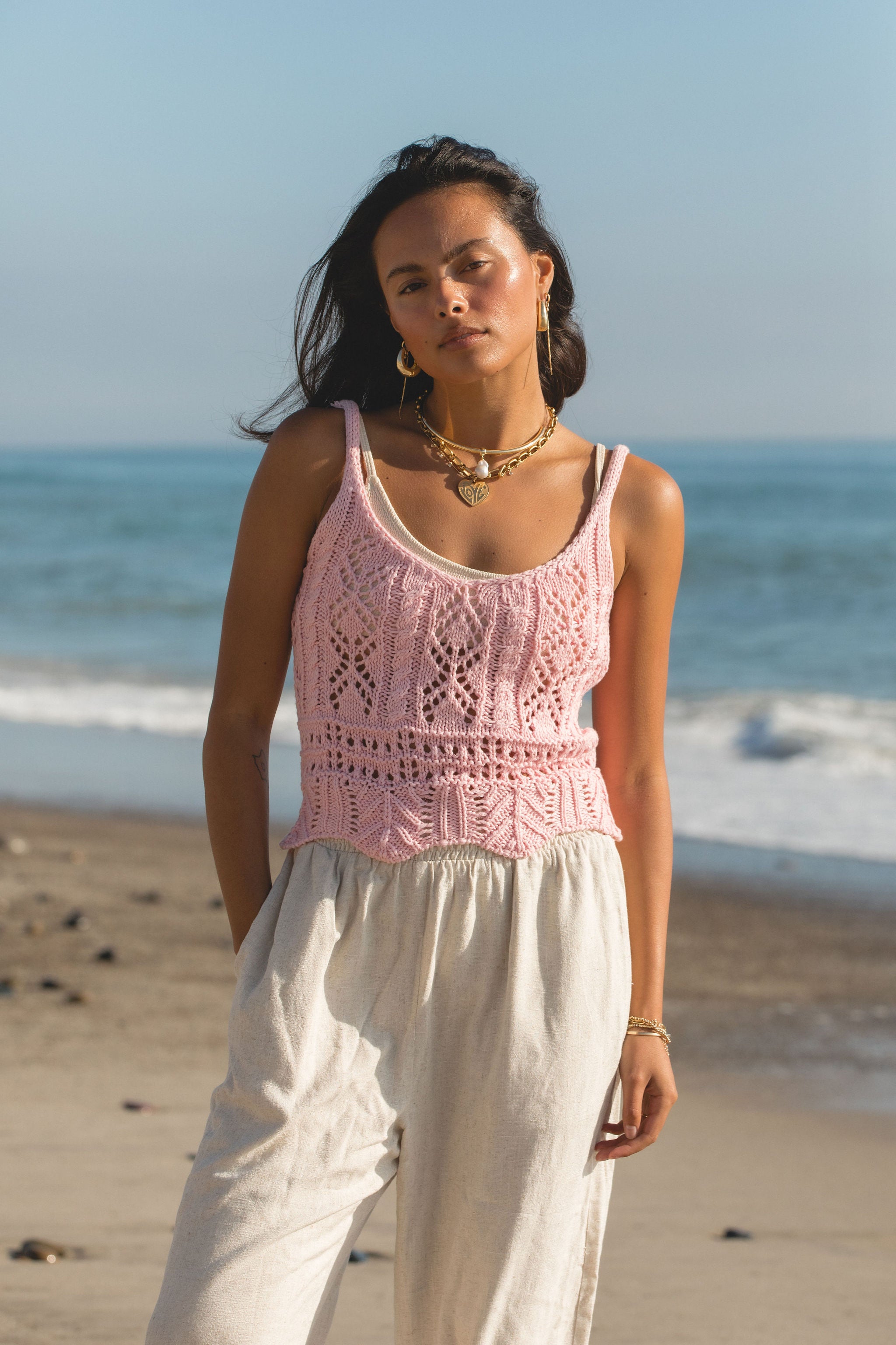 This Tropical Crochet Knit Tank is the perfect addition to your summer wardrobe. The light pink delicate crochet knit adds a touch of femininity, while the scalloped hem adds a unique detail. This versatile piece can be used as a swim cover up or paired with breezy bottoms for a stylish and comfortable look.