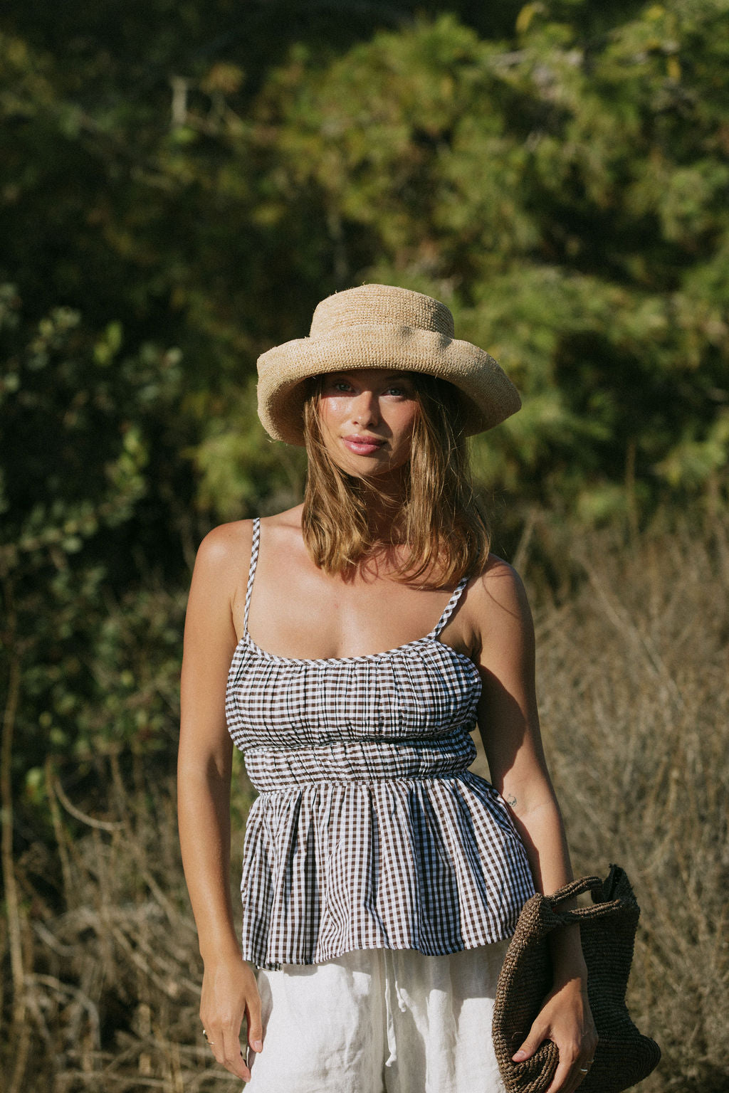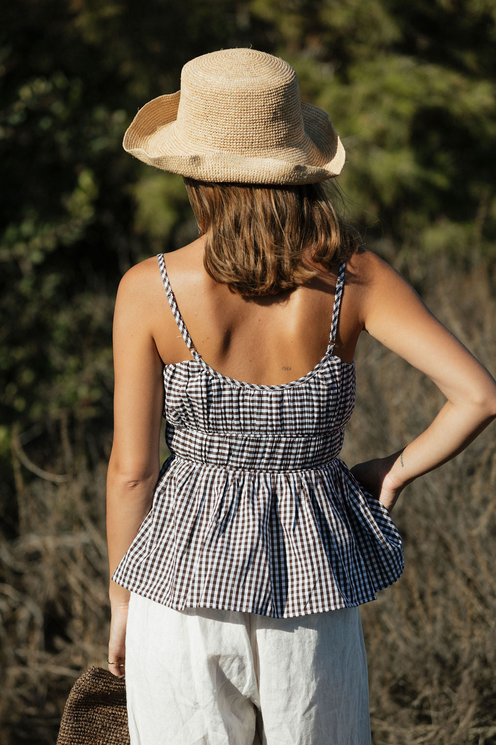 The Bonny Gingham Cotton Top features a cinched design with a flared, babydoll fit, creating a flattering silhouette that adds effortless style to your wardrobe. Its rich cocoa gingham print offers a subtle yet striking pattern, ideal for layering into your fall outfits. Transition seamlessly from sunny to cooler days with this versatile top.