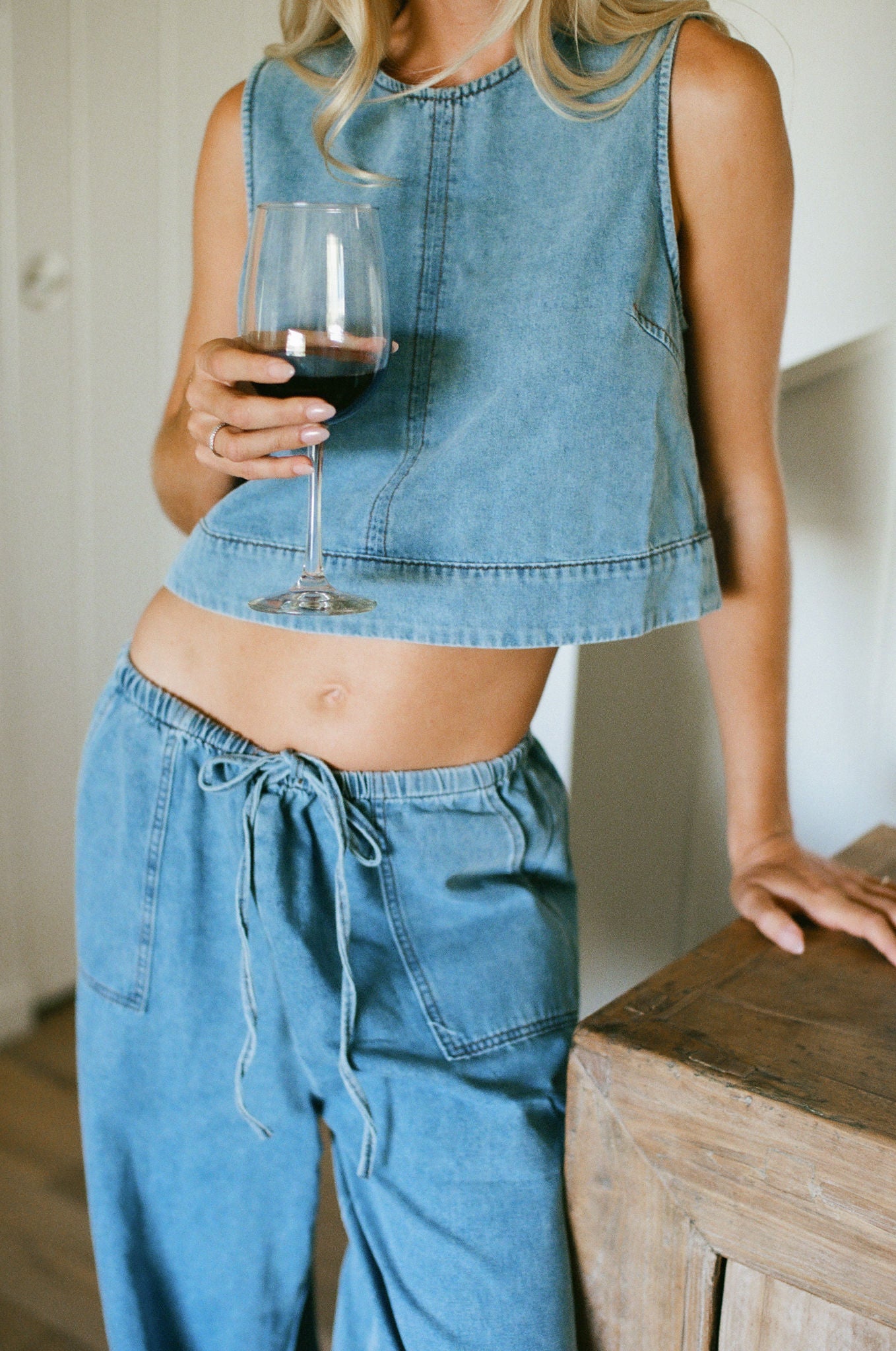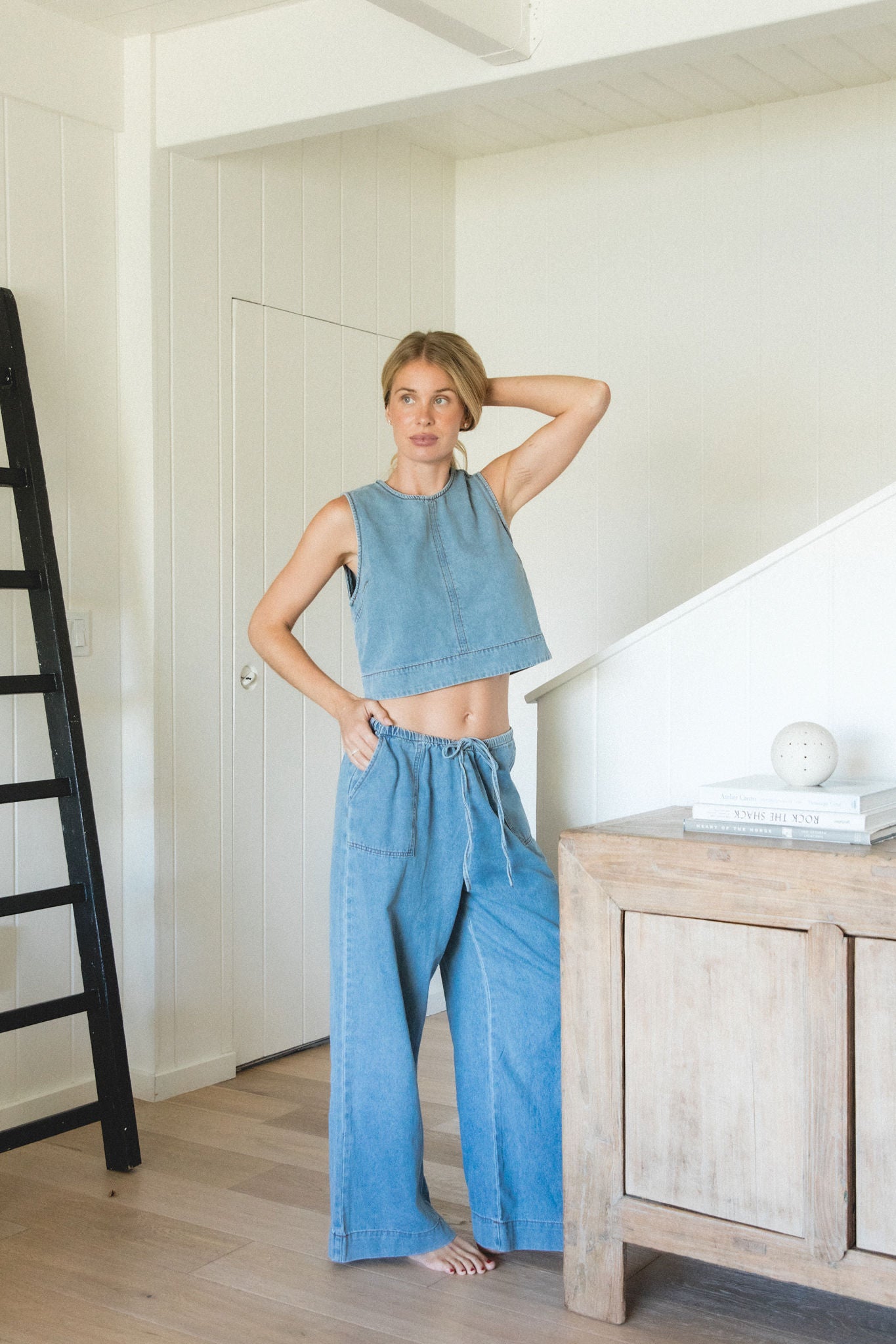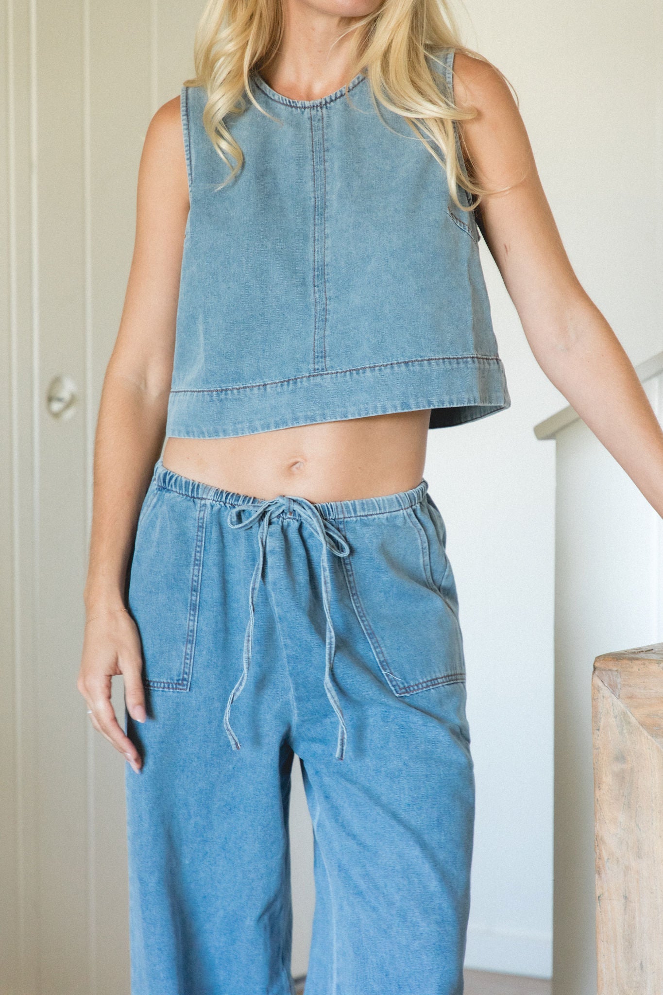 The Brooks High Neck Top reimagines denim on denim with a modern, structured silhouette. Its cropped length and sleeveless cut highlight the waist, while the high neckline adds a polished look. The medium wash denim is soft to the touch yet durable, making it a transitional piece that pairs effortlessly with both casual and elevated bottoms.