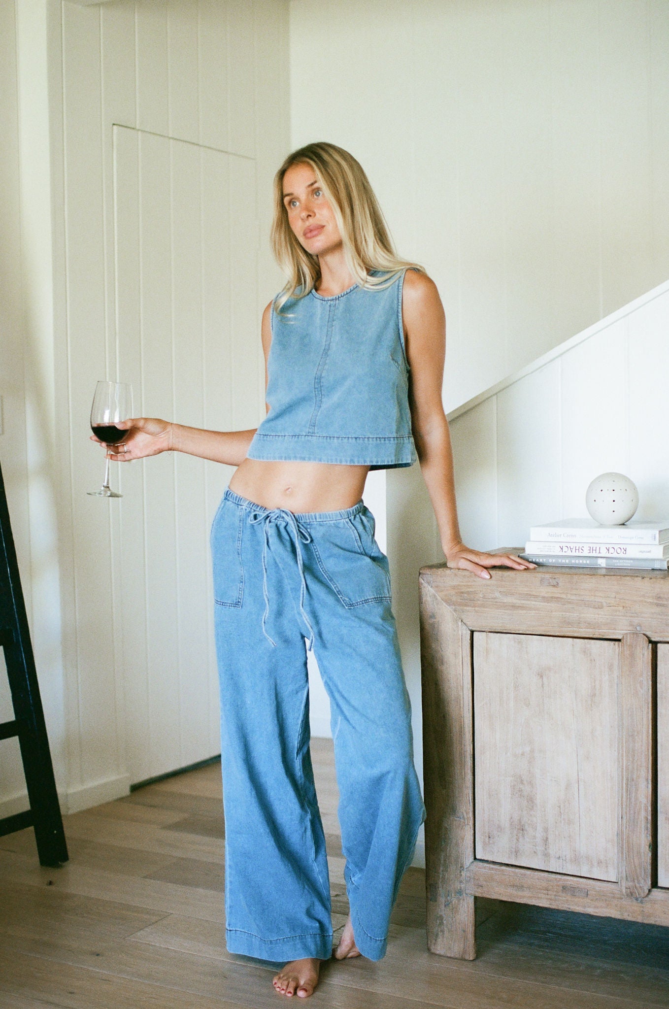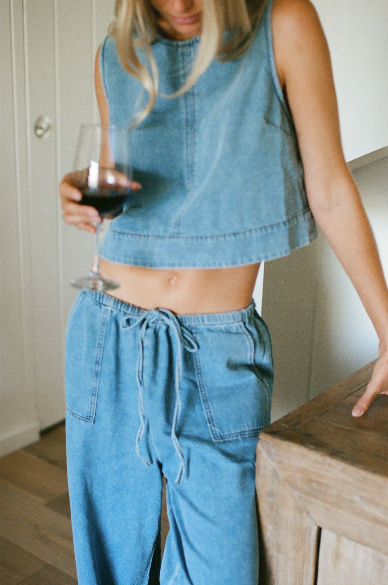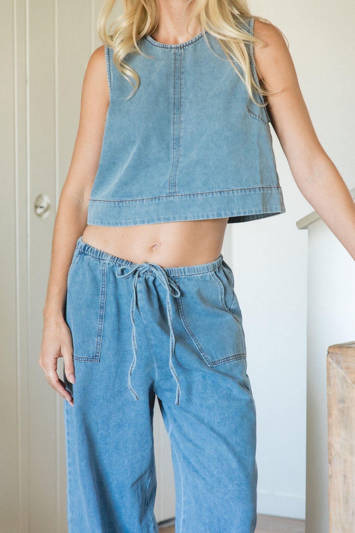 The Brooks High Neck Top reimagines denim on denim with a modern, structured silhouette. Its cropped length and sleeveless cut highlight the waist, while the high neckline adds a polished look. The medium wash denim is soft to the touch yet durable, making it a transitional piece that pairs effortlessly with both casual and elevated bottoms.