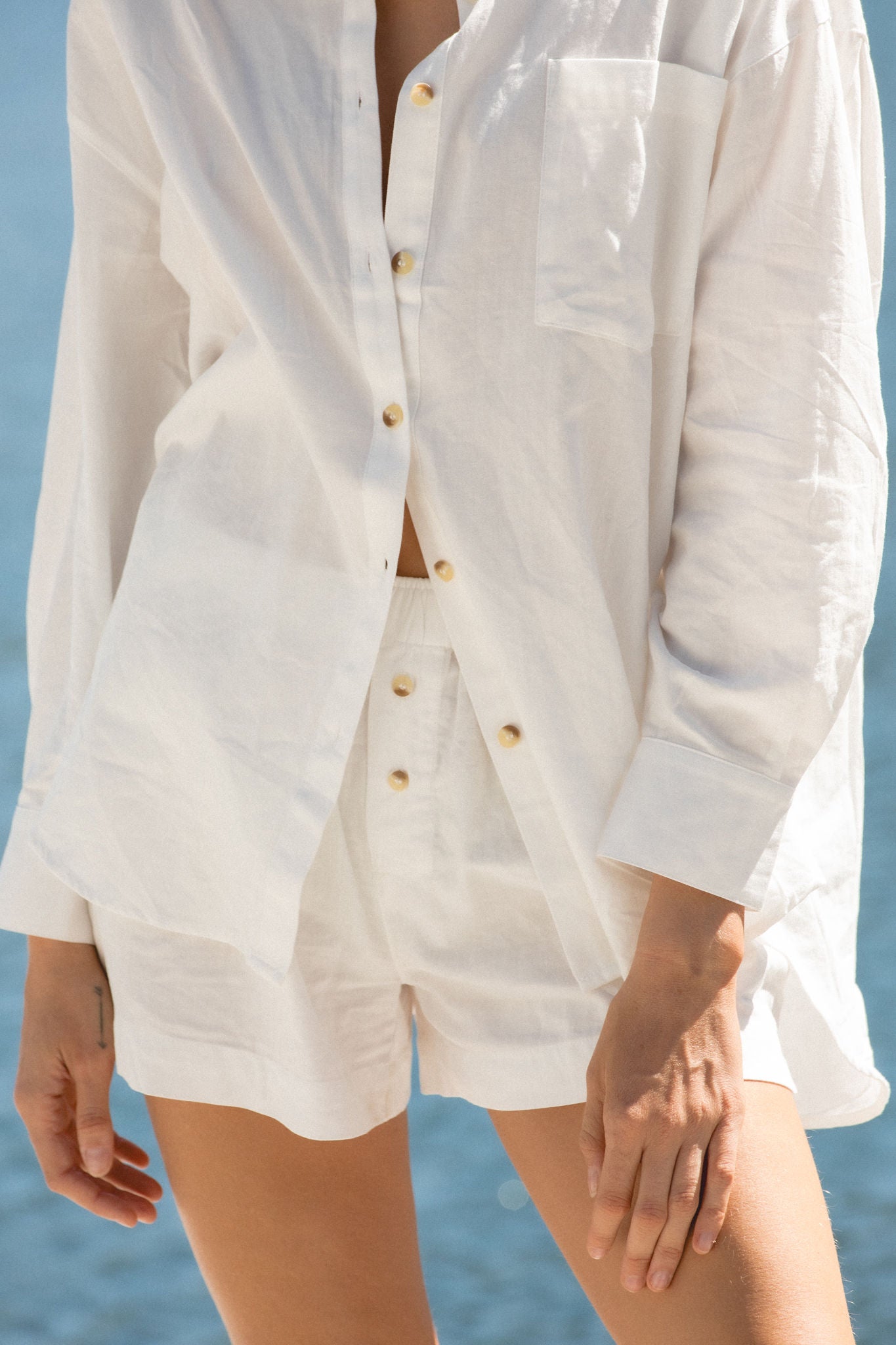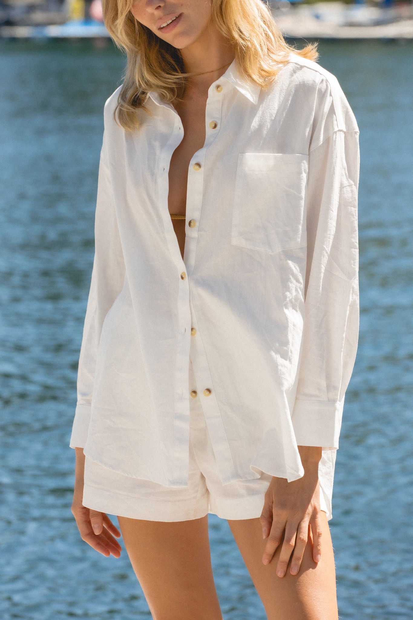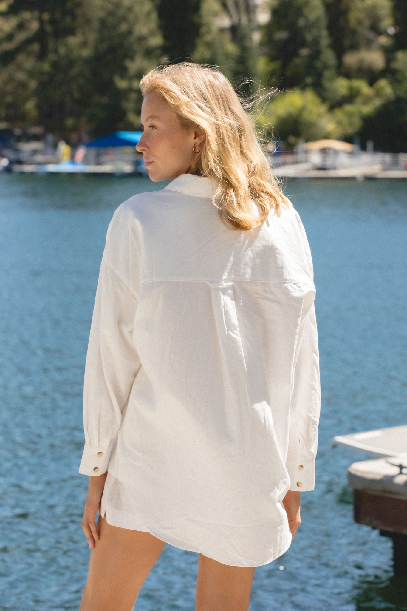 This long-lined button top features a slightly oversized cut that delivers both comfort and style. Crafted with attention to detail, it includes distinctive brown buttons that add a refined, special touch. Style with the matching Lakeside Cotton Button Shorts or layer with denim & sweaters this fall.
