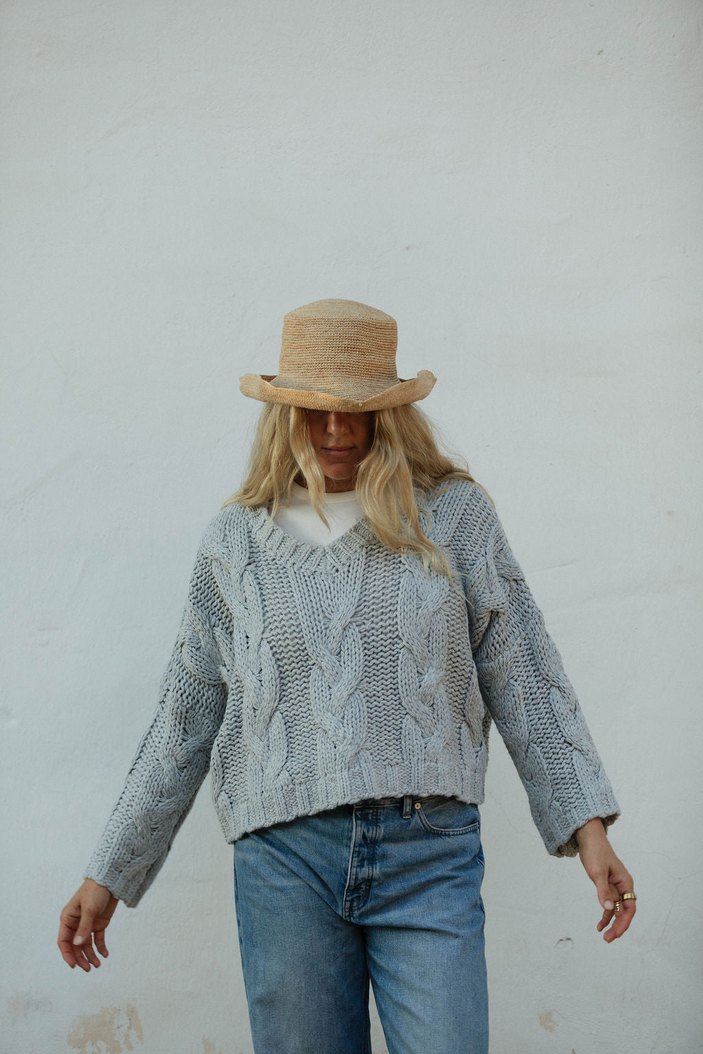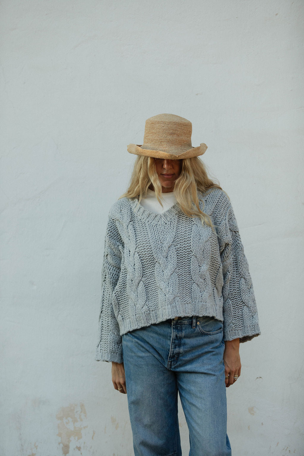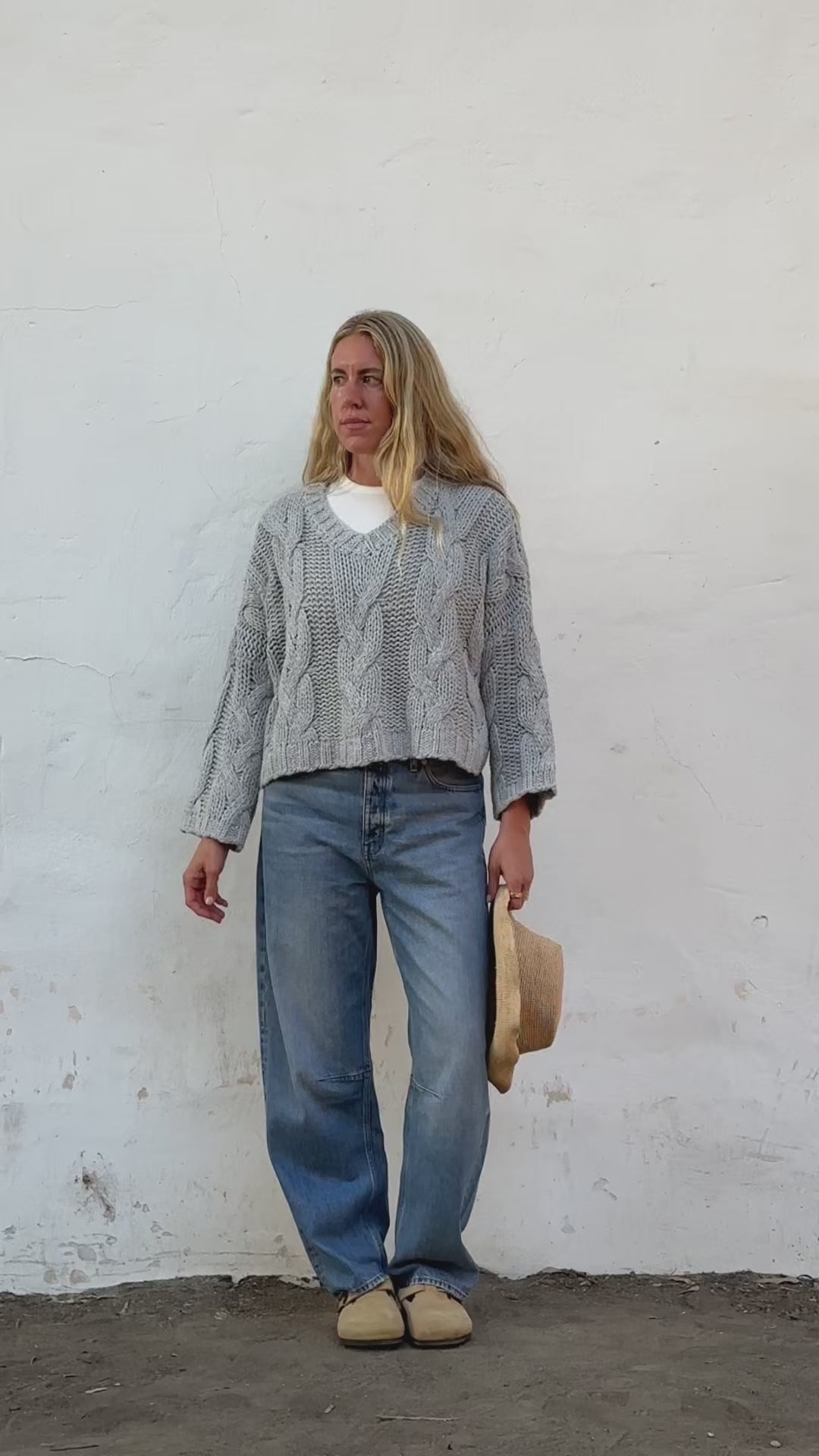 The Nash Cable Knit Sweater combines a soft, chunky yarn knit with expert craftsmanship for a cozy yet refined feel. Its boxy, cropped silhouette and cropped sleeves create a modern, minimalist look that layers effortlessly. Perfect for elevating casual outfits with textured comfort and a flattering V-neck detail.