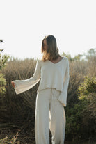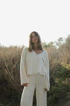 The Saturday Morning Knit Pullover features a classic v-neck and wide long sleeves for a relaxed yet refined silhouette. Designed with a true-to-size fit, it ensures comfortable wear throughout the day. Pair it effortlessly with the matching Saturday Morning Knit Pants for a cohesive, polished look that combines casual ease with elevated style.