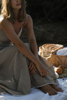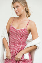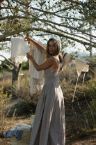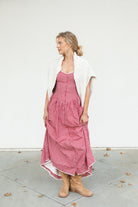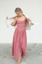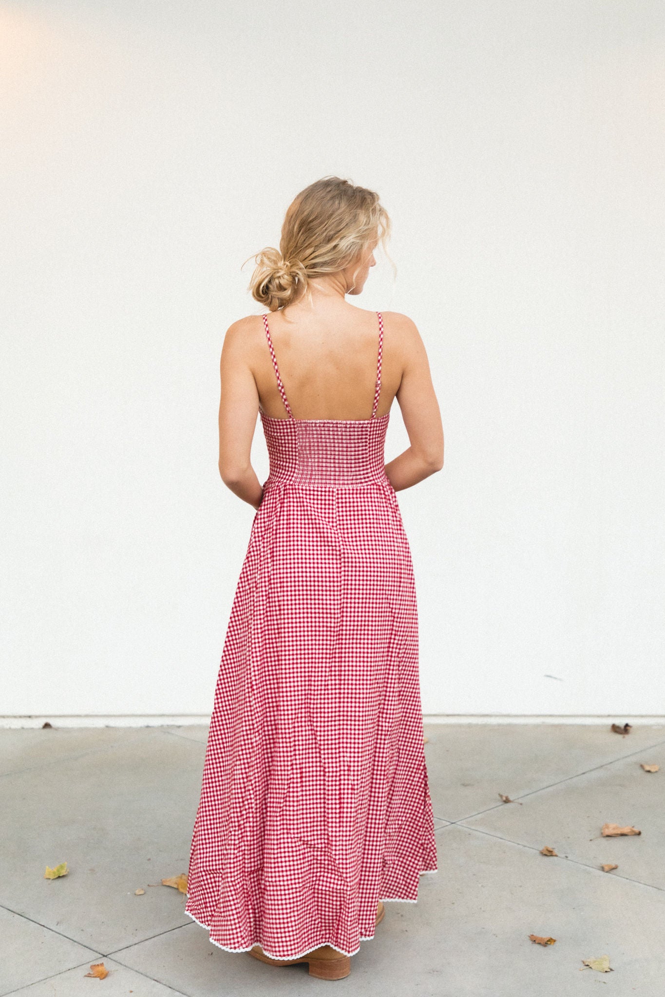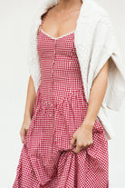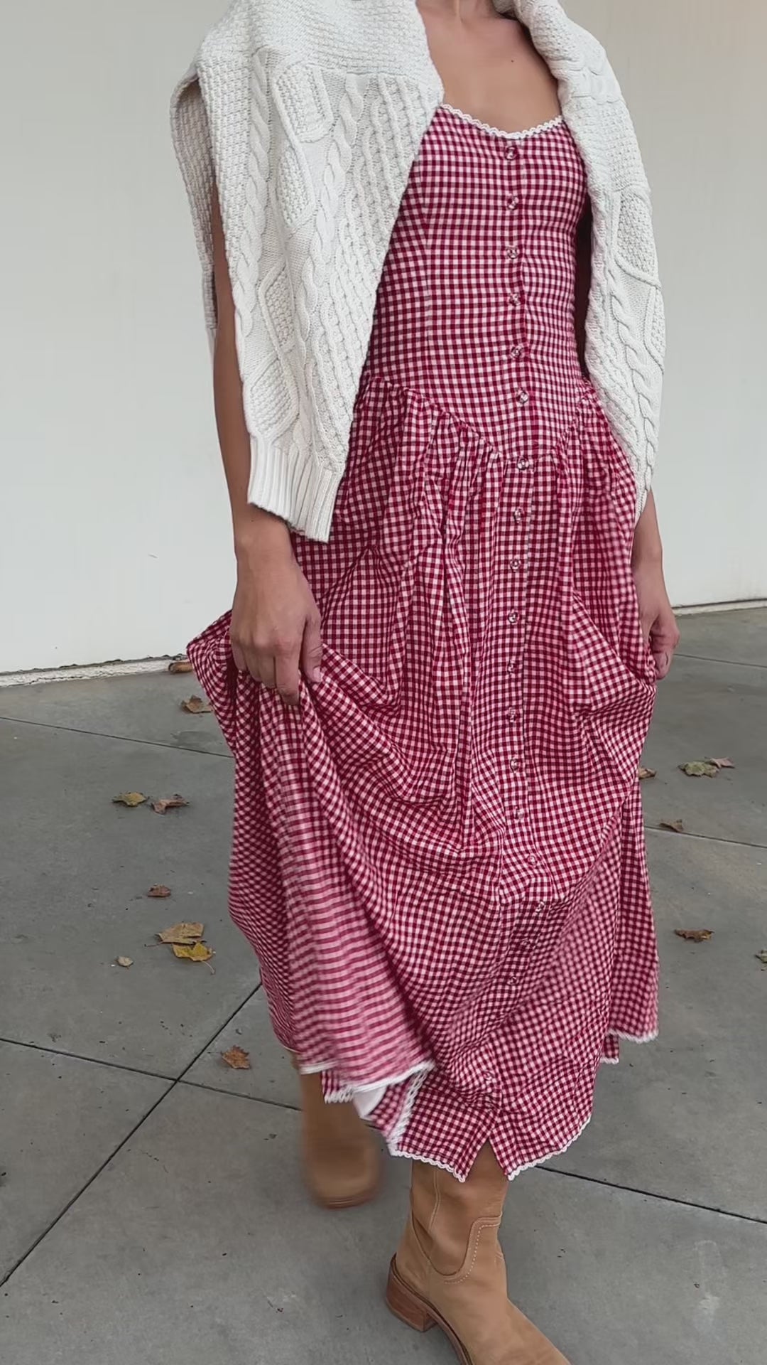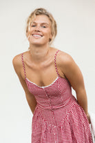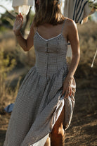 The Clara Gingham Maxi Dress features a classic gingham print with a scooped neckline trimmed with delicate lace, complemented by button-up front closure and an invisible side zipper for a seamless fit. A shirred band at the back ensure comfortable wear. This dress offers breathability and structure, making it ideal for elegant, all-day wear.