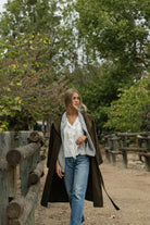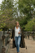 The Hayes Trench Coat combines classic style with refined materials, featuring a dark olive brown tone that enriches its timeless appeal. Crafted with a 100% cotton corduroy fabric, it offers a textured finish that enhances durability and comfort. Designed with a tie belt, this coat allows for a customizable fit, balancing structured tailoring with practical wearability.