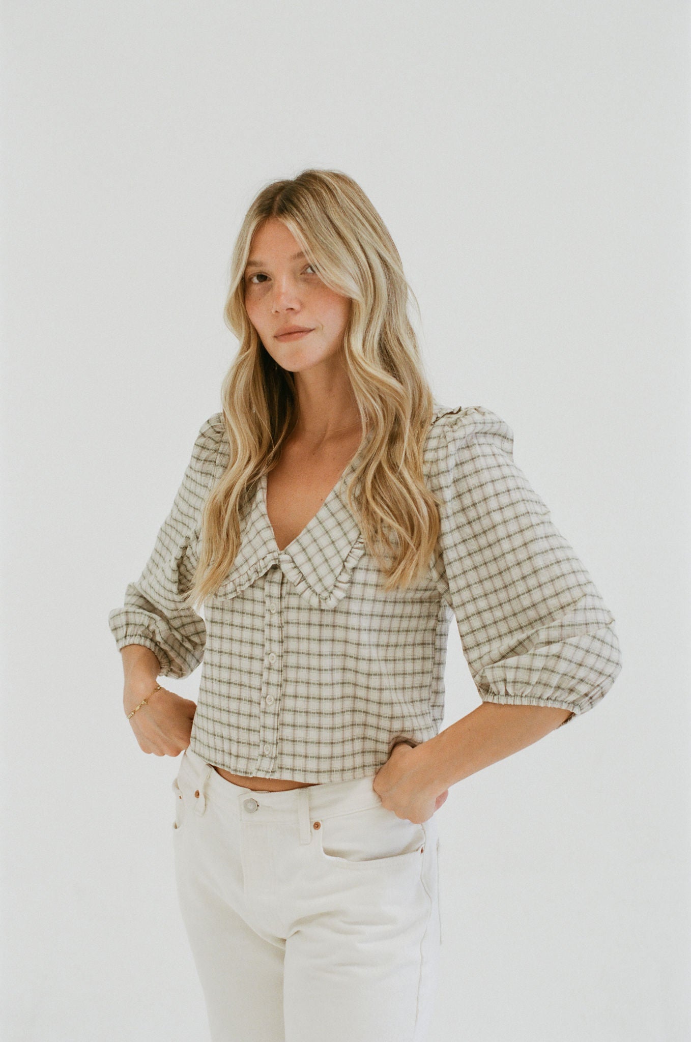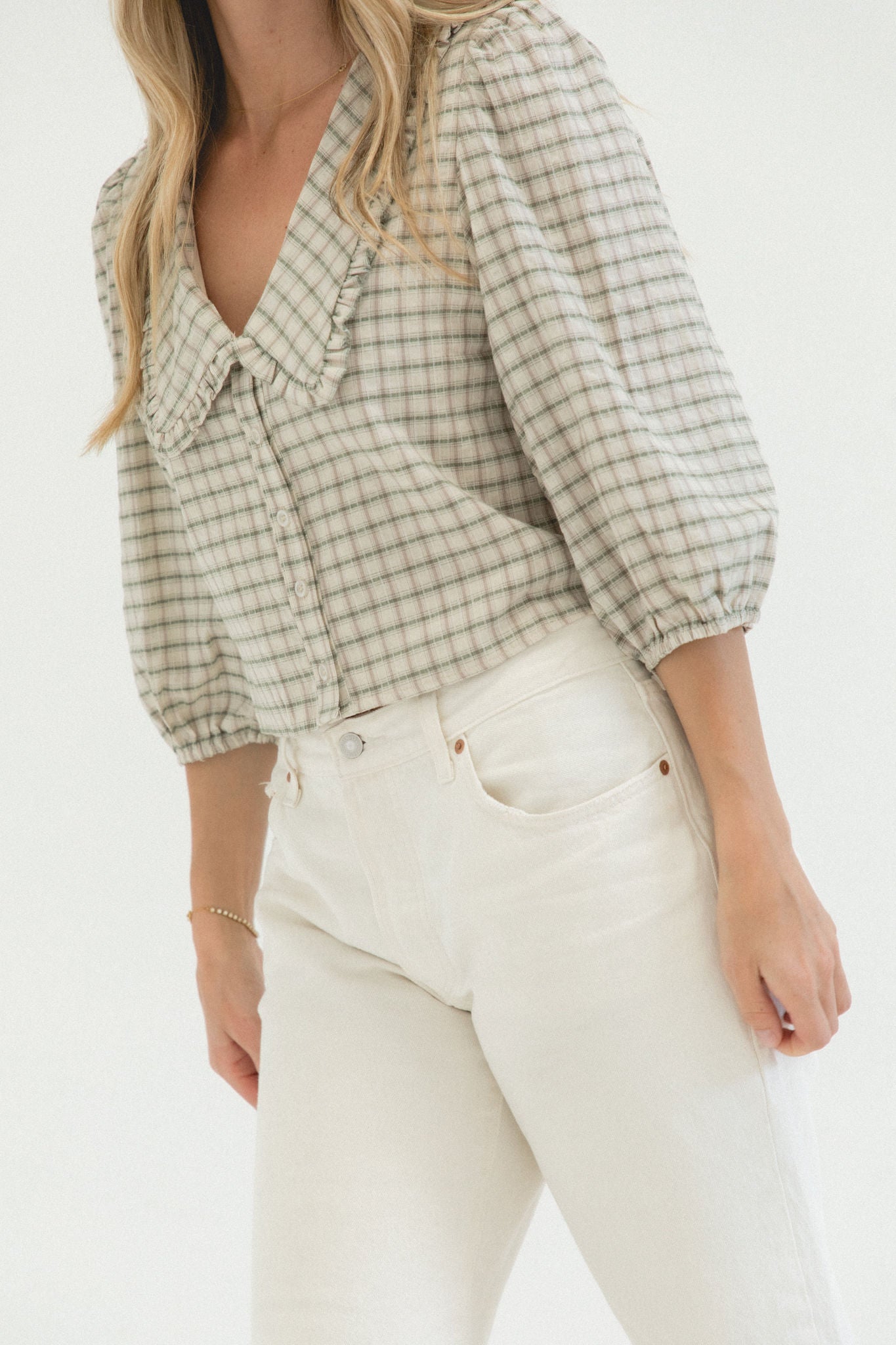 Classic with a feminine twist, the Linden Gingham Cotton Blouse features a timeless gingham print in a breathable cotton finish. Designed with a flattering v-neckline, soft ruffle collar, and easy quarter sleeves, it’s the perfect balance of structure and charm.
