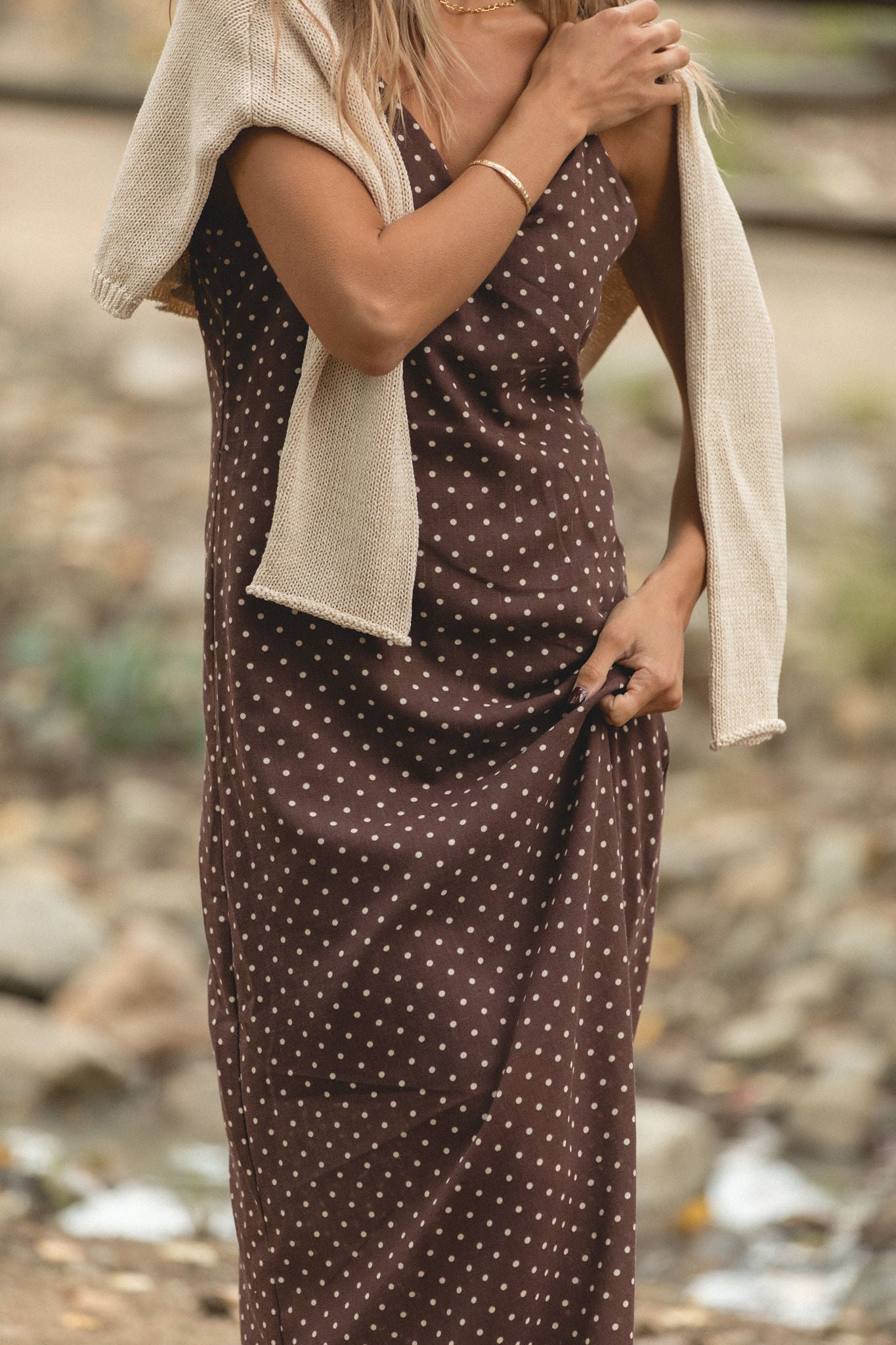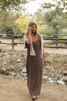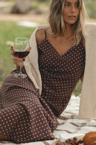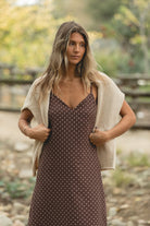 Elegant and effortless, the Opal Maxi features a subtle cocoa polka dot pattern with a fluid drape that moves beautifully. Its easy silhouette layers perfectly with cardigans, jackets, and boots, making it a go-to dress for transitional days and winter gatherings.