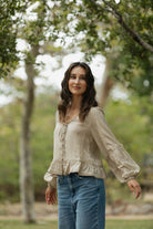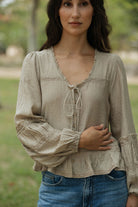 The Opal Ruffle Long Sleeve Blouse offers a relaxed, oversized fit for effortless comfort and style. Crafted from soft, breathable fabric, it features a tie detail at the front, a delicate ruffle hem, and balloon sleeves with cinched cuffs, creating a sophisticated yet approachable silhouette perfect for any occasion.