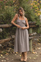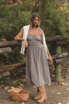 Soft, romantic, and effortless, the Posie Gingham Midi is crafted from breathable cotton in a warm cocoa check. The smocked bodice and flowy skirt create a flattering, wearable silhouette designed for year-round layering. Pair it with boots and knits for an easy winter transition.