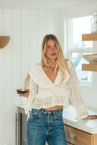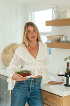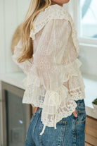 The Sorene Ruffle Lace Blouse combines delicate ruffles, lace panels, and subtle embroidery for effortless holiday elegance. Thoughtful ties and layered details add movement and dimension, creating a refined, feminine silhouette perfect for festive occasions.