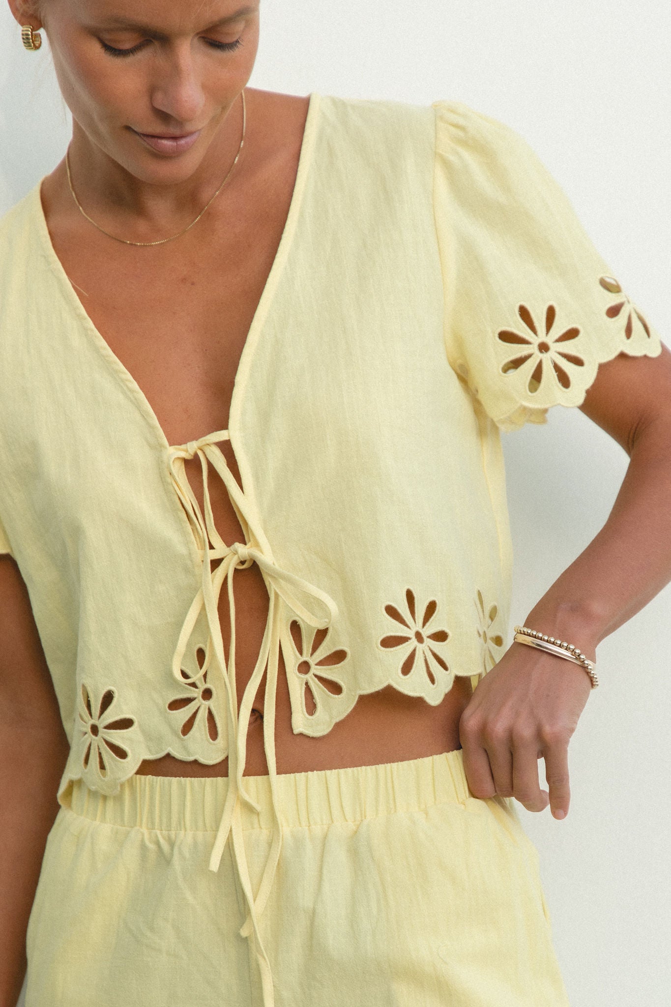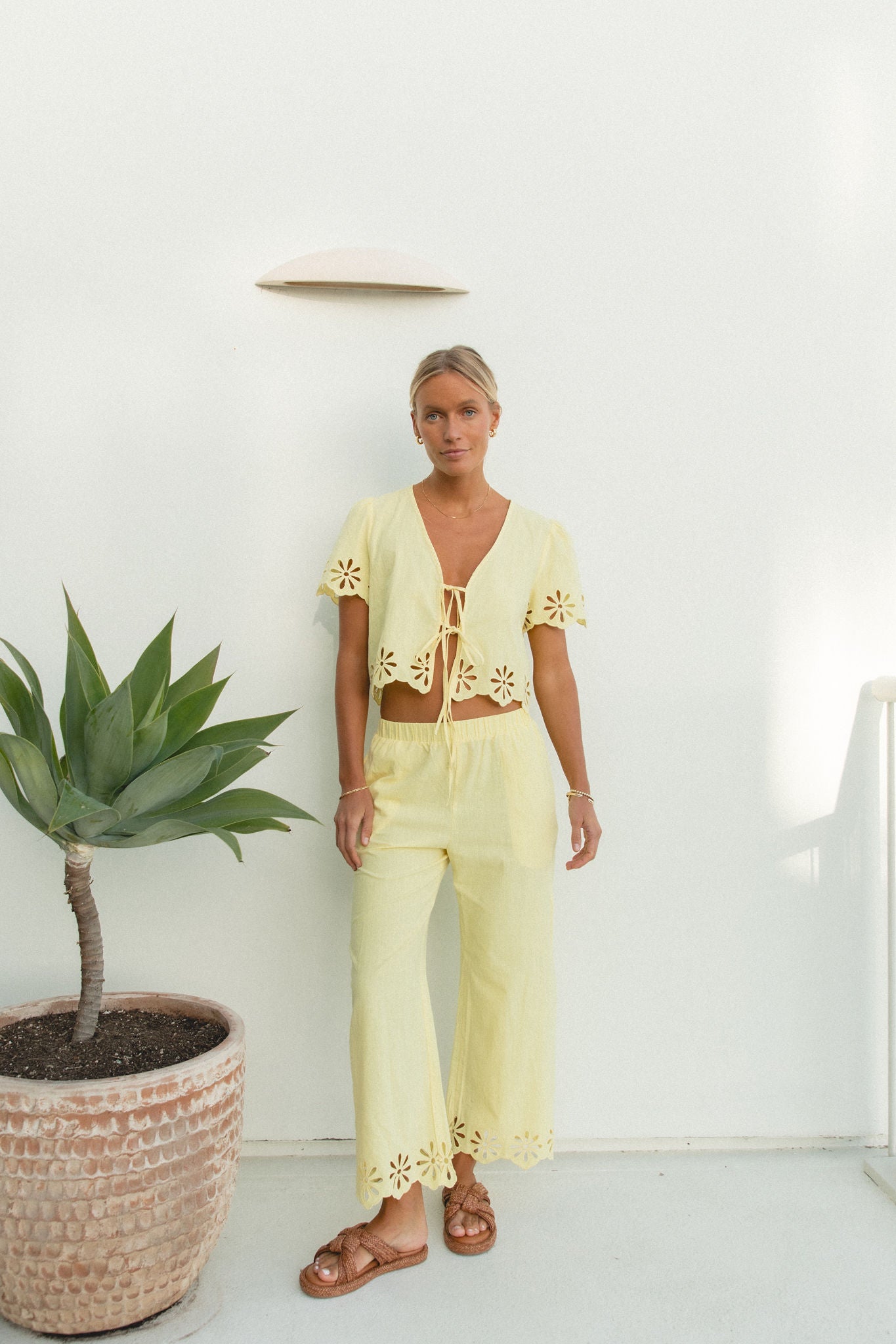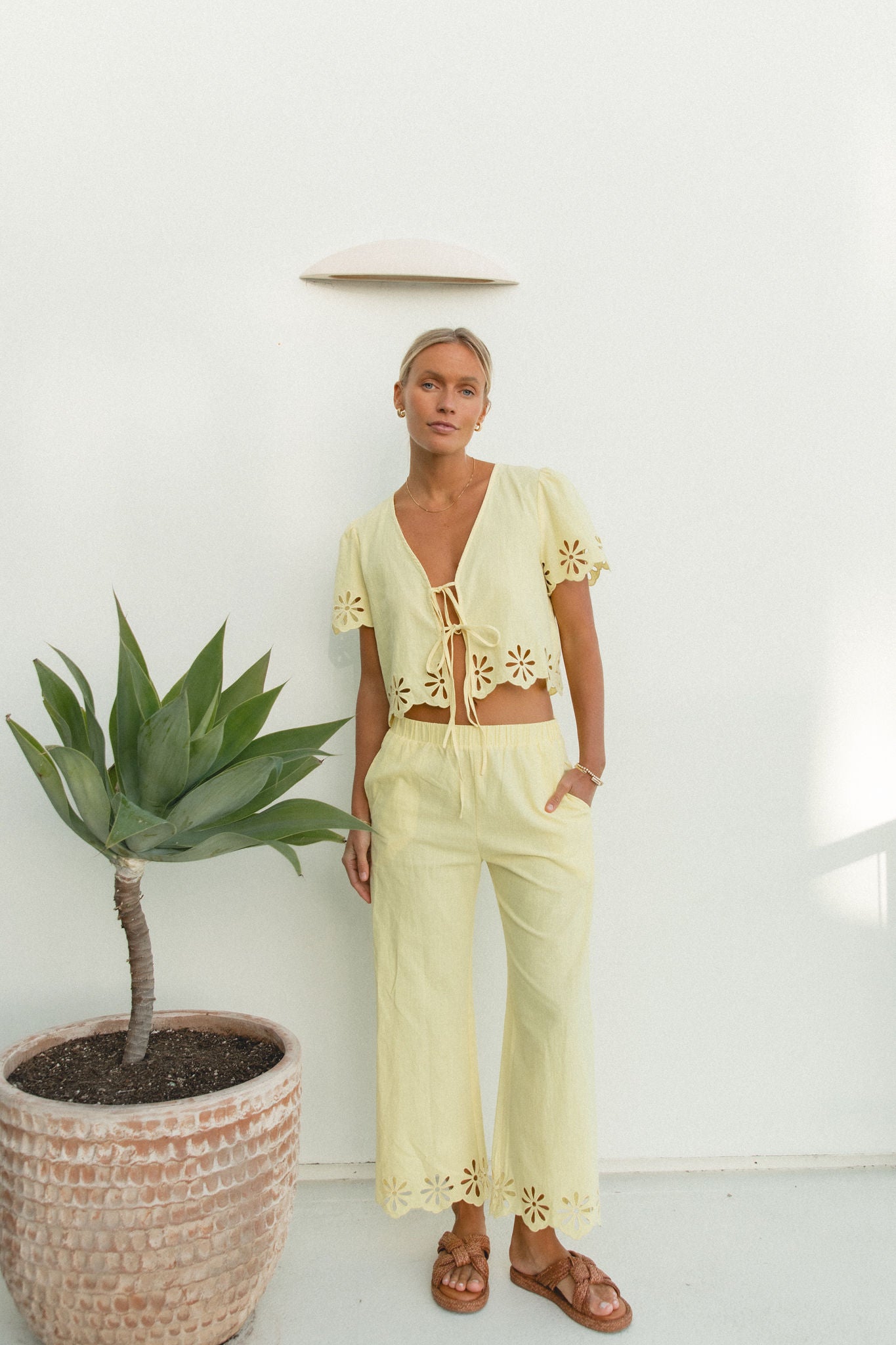 The Brentwood Woven Cotton Set is a must-have for any spring getaway. Made with 100% cotton, this set features a tie top and cropped pants with a delicate floral eyelet detail.
