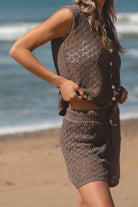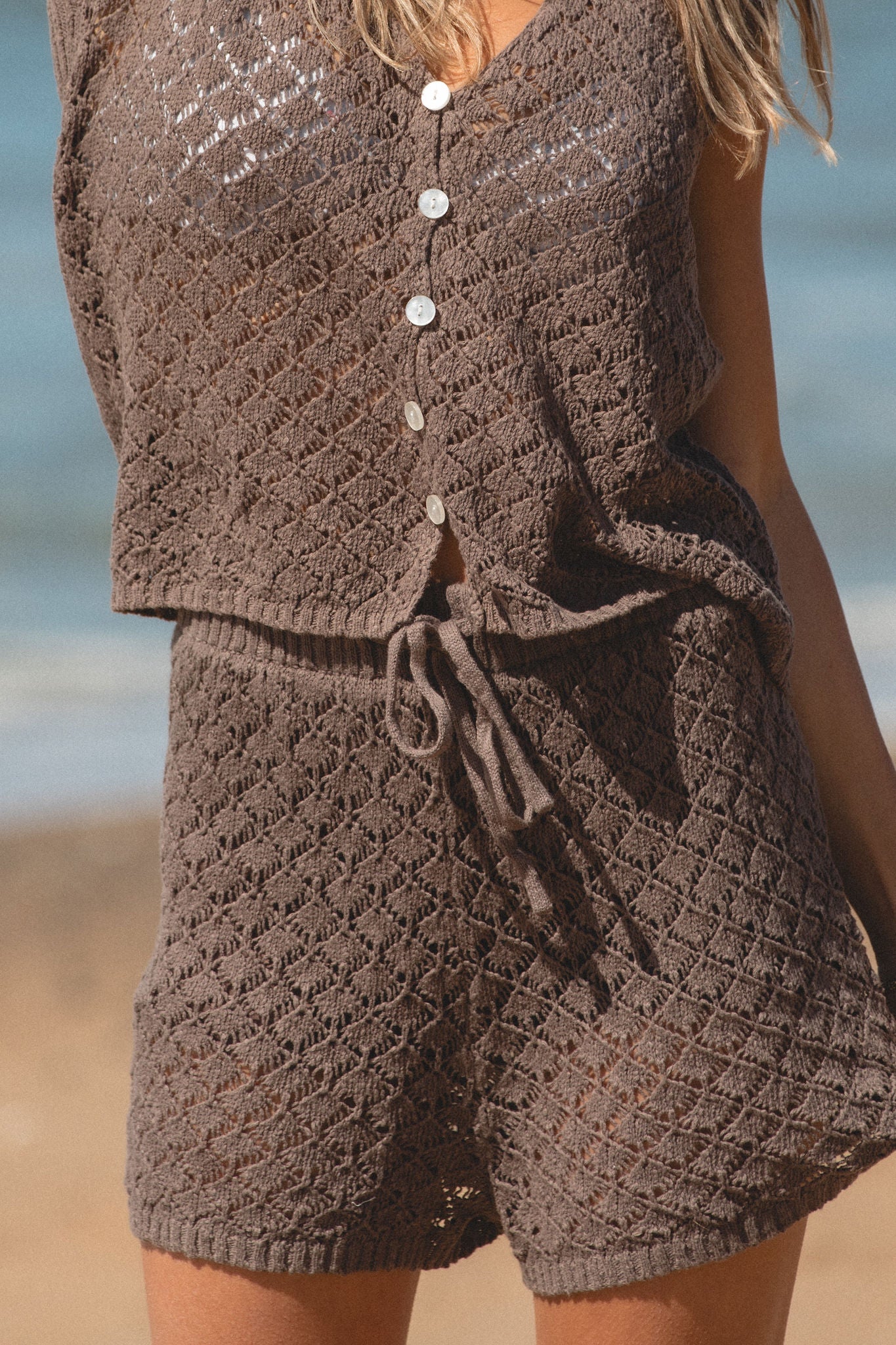 The Thalia Knit Shorts are the perfect addition to your summer wardrobe. The crochet knit set in cocoa provides a stylish and comfortable look that is perfect for a spring day under the sun. The drawstring shorts offer a flattering and comfortable fit.