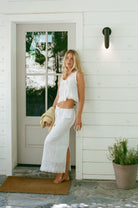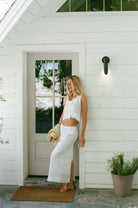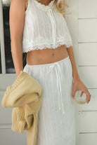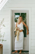 Elevate your wardrobe with the Haven Eyelet Cotton Maxi Skirt, featuring a timeless column silhouette featuring delicate eyelet fabric. Fully lined and has a back slit that adds subtle movement.