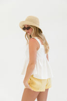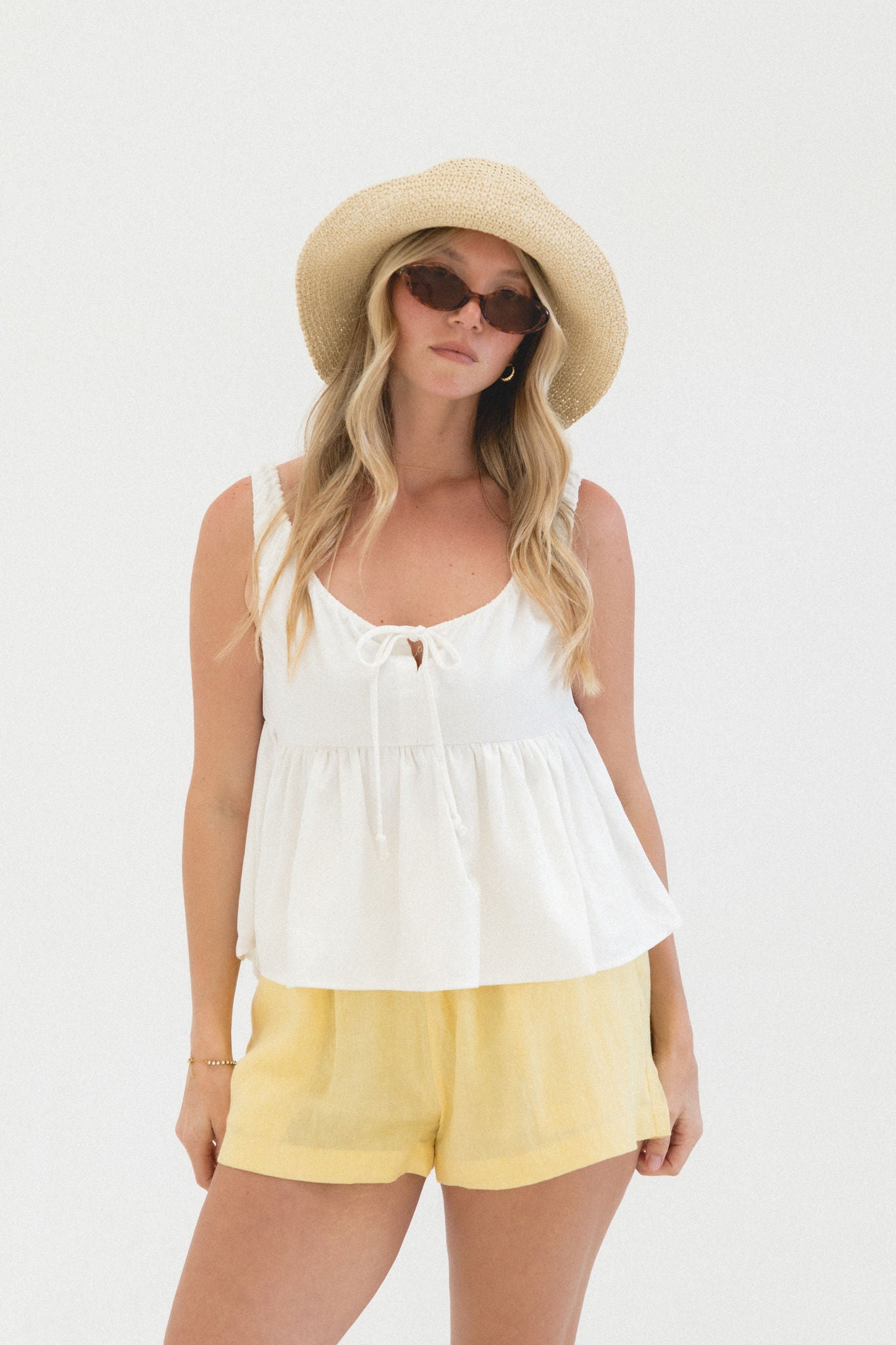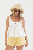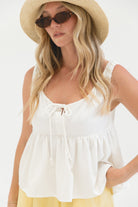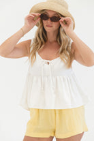 The Brightly Woven Cotton Tank is a warm-weather favorite. Designed in a structured babydoll silhouette, it features comfortable stretchy straps and a subtle front tie detail for added shape and charm. Easy to pair with shorts or linen pants for sunny days ahead.