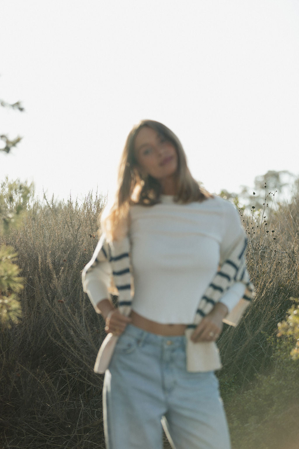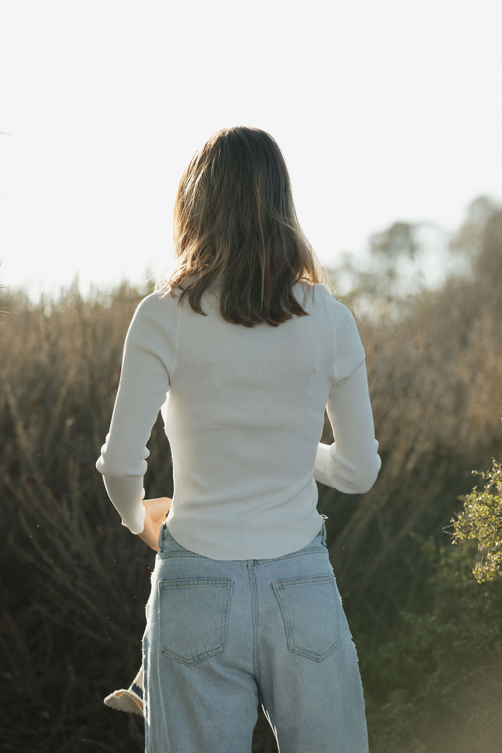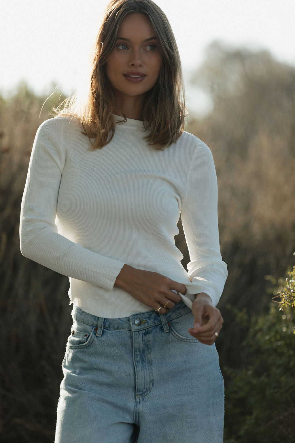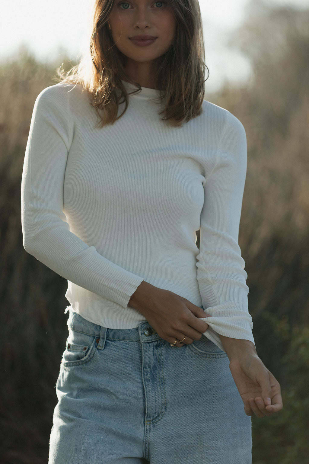 The Slow Down Ribbed Long Sleeve features a high neck and fitted shape that contours the body comfortably. Its ribbed texture adds subtle depth, while the scooped hem introduces a twist to classic long sleeve design.