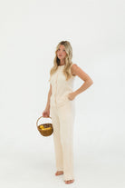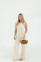 This set features a sleeveless button-up top and flared pants in a breezy cotton knit, finished with a wide-rib texture for that perfect coastal touch. Style it up or down—the options are limitless.